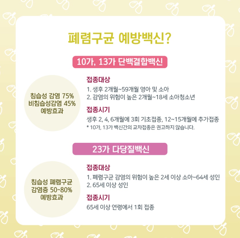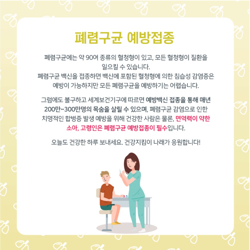 폐렴 구균에 의한 침습성 감염은 영아 및 어린 소아와 65세 이상의 고령자에서 발생 빈도가 높기 때문에 어린 자녀와 고령자가 있는 집안에서는 필수 예방접종입니다.