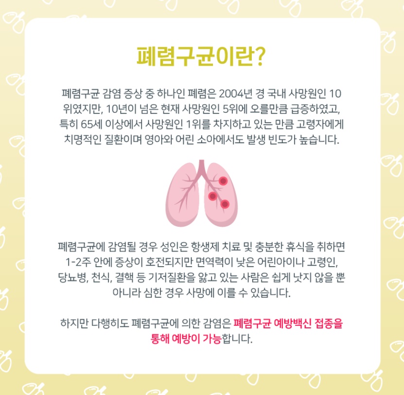 65세 이상 어르신에서 폐렴 구균으로 인한 침습성 폐렴구균 감염증은 치명적이며, 균혈증의 경우 60%, 수막염의 경우 80% 사망에 이르는데요.