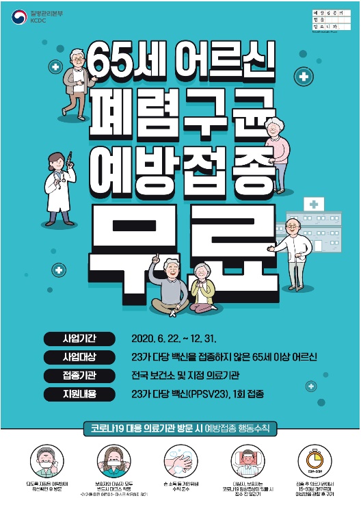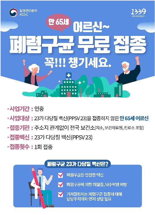 65세 이상 어르신에서의 침습성, 폐렴구균 감염병을 예방하기 위해 '어르신 폐렴구균 예방접종 사업'을 실시하고 있다고 해요.