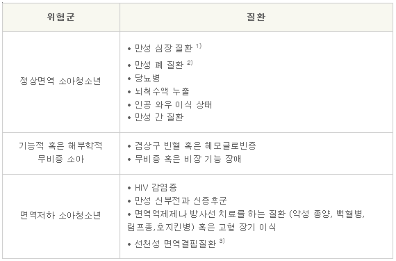 . 면역저하, 무비증, 뇌척수액 누출, 인공와우 이식 상태에 있는 6~18세 소아 청소년