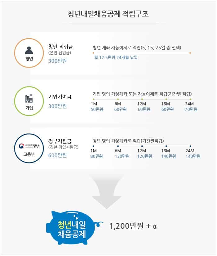 청년 본인이 2년간 300만원(매월 12만 5천원)을 적립하면 정부(취업지원금 600만원)와 기업(300만원, 정부지원)이 공동 적립